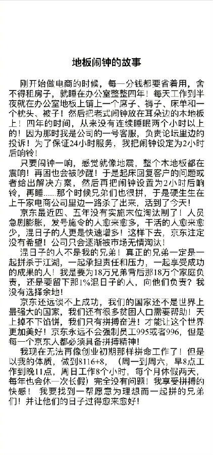昨日 刘强东跟马云在微博谈996工作制,他们表示:不会强制员工996,什么是996?996就是指工作日早9点上班,晚上9点下班,中午和晚上休息1小时(或不到),总计10小时以上,并且一周工作6天的工作制度,是非常辛苦且严重违反劳动法践踏人权的工作制度。也有的人说:企业一向都不是让所有员工越来越好,而是让那些愿意和公司一起拼的员工越过越好,不能一起拼的自然要淘汰,何来兄弟之说,企业经营要无情,对人要有情,“无情”才能适应市场,因为市场是无情的,但对于能和企业一起奋斗的人要有情,而且基本只针对优秀者有情,对不好好打拼的人一定是要无情淘汰,这就是以奋斗者为本,否则就是对优秀者的不公平。所谓:“优胜劣汰”
